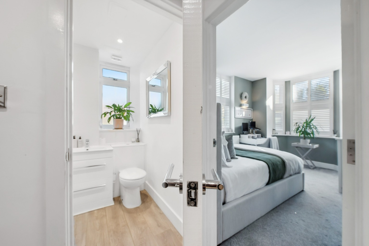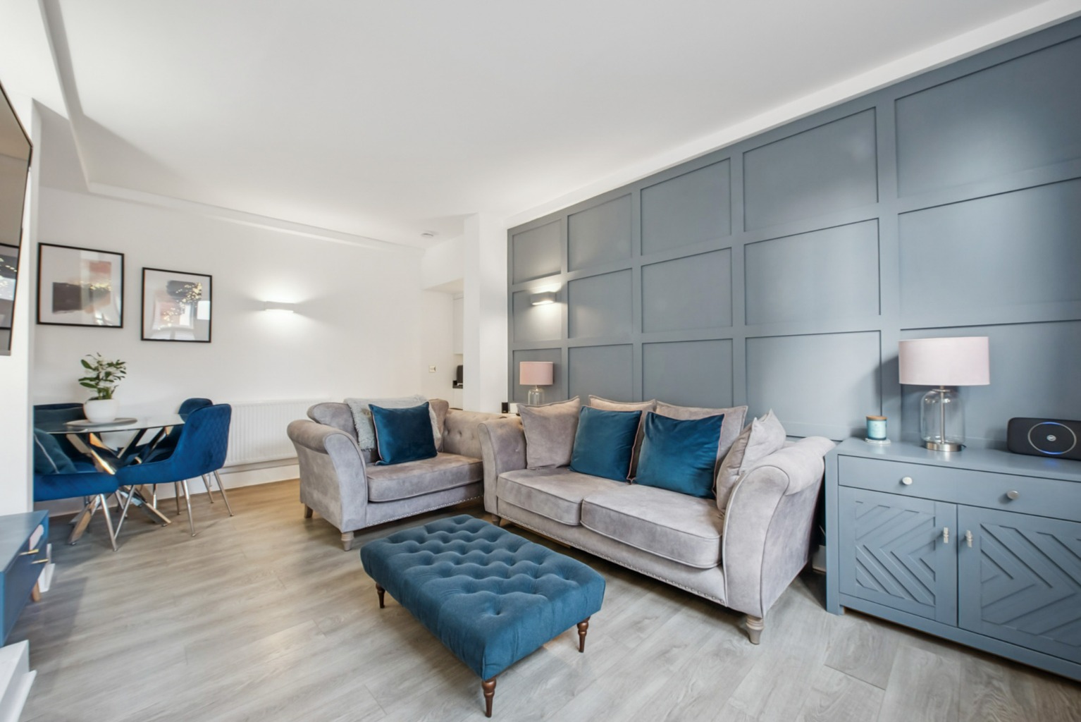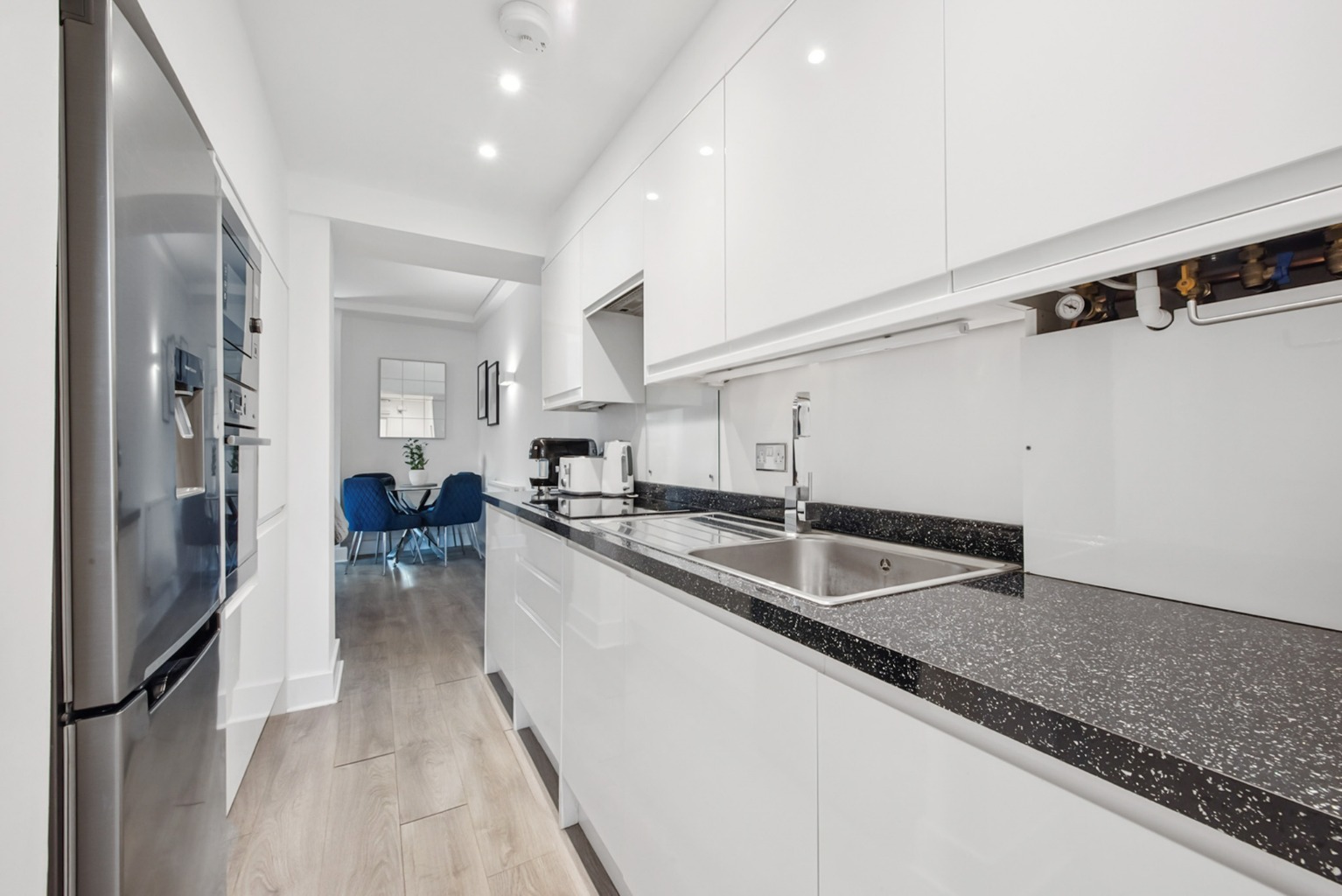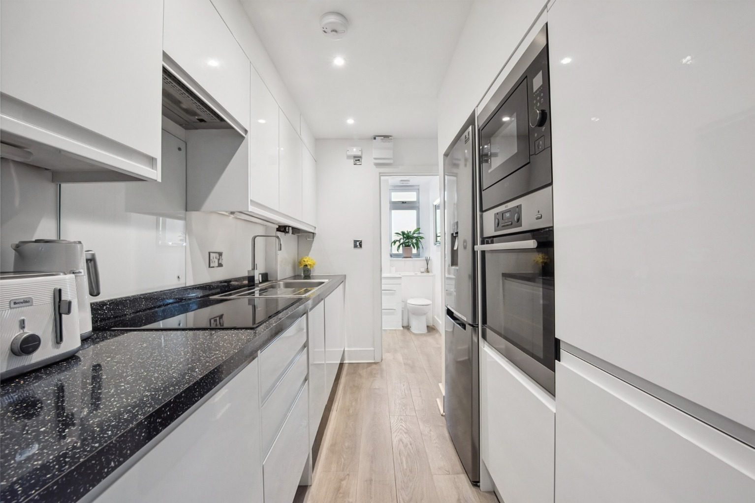 As you enter the apartment, you are greeted by a bright and well-proportioned living space, perfect for relaxing or entertaining guests. The beautiful standard of this property is evident throughout, with high-quality finishes and an ambiance that is both inviting and contemporary. The open-plan layout seamlessly connects the living area with the kitchen, creating a sociable and functional space. The Kitchen also offers top of the range integrated appliances (AEG) such as induction hob, oven, microwave, dishwasher and washing machine