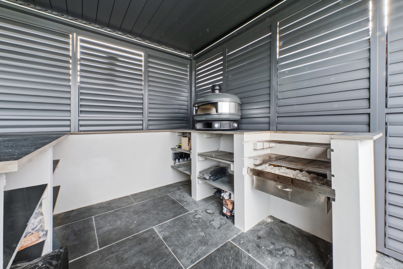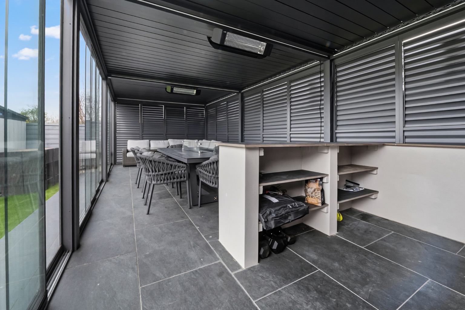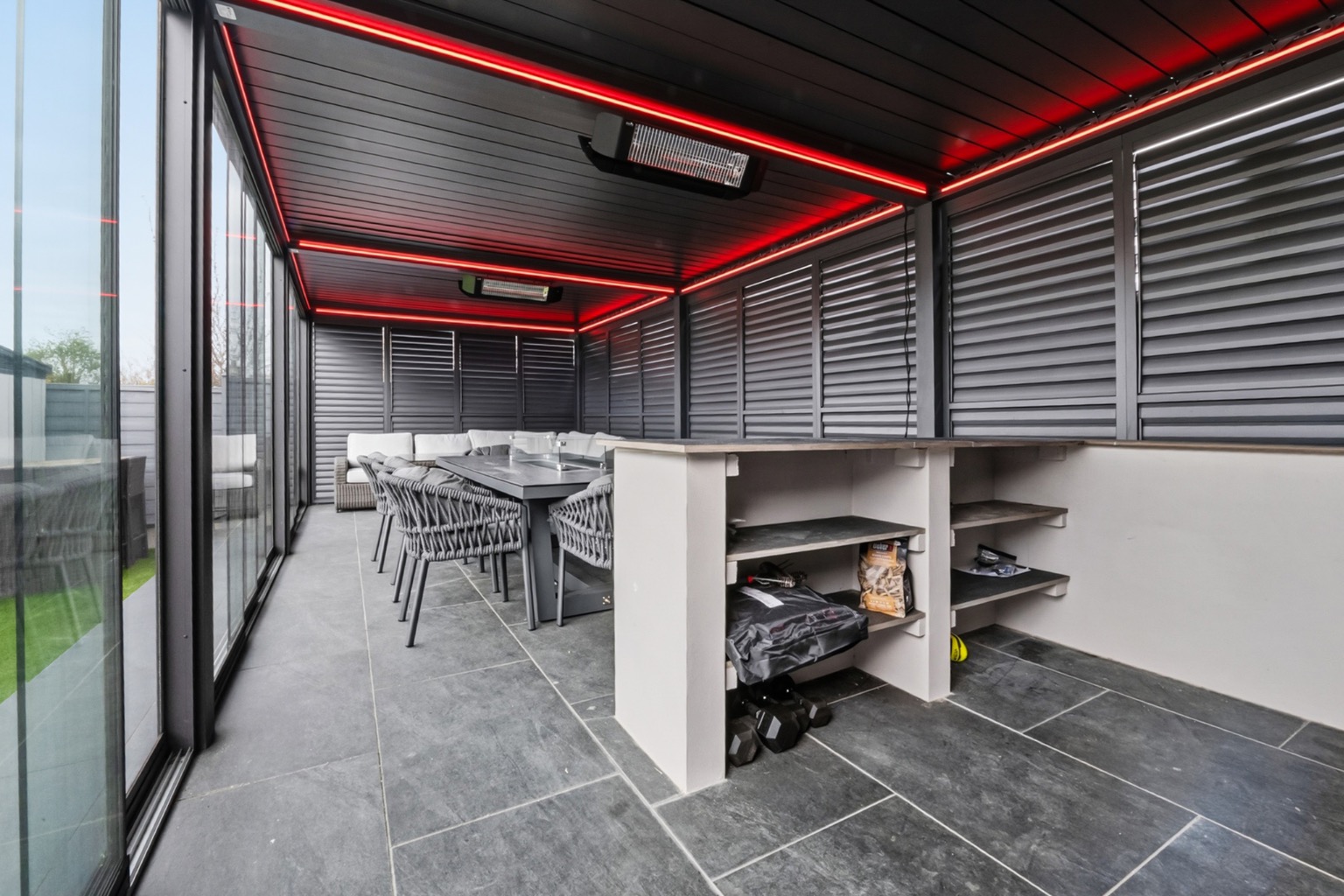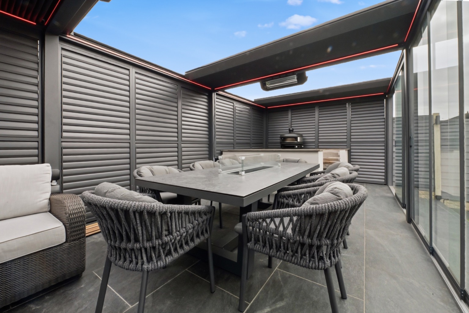 FULL WIDTH OF GARDEN PERGOLA THAT HAS RETRACTABLE ROOF AND BBQ AREA
