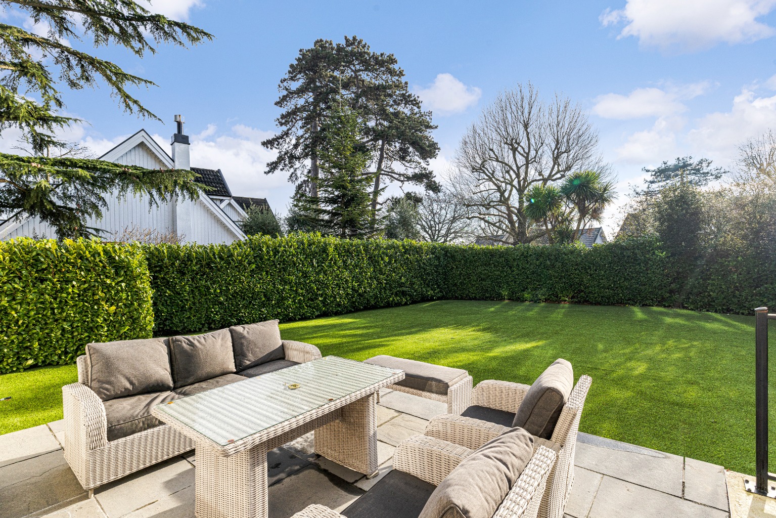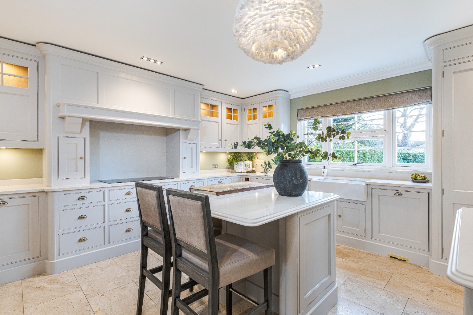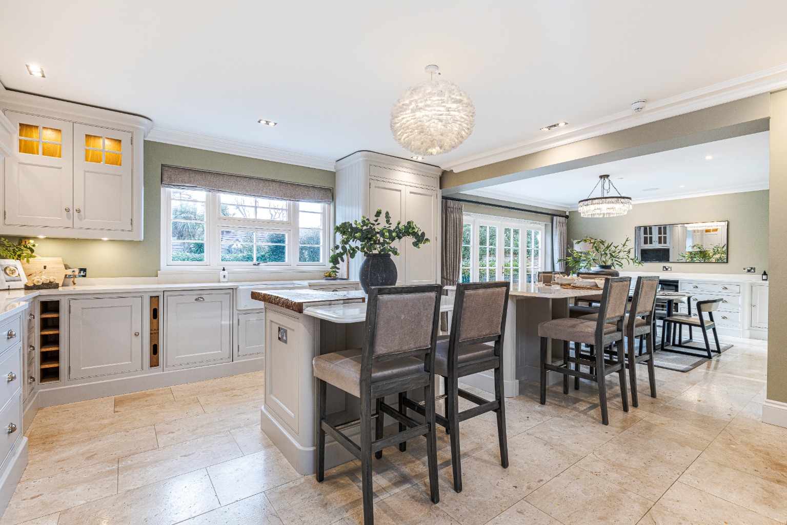 Approached via a private driveway and secured by electric gates, this residence ensures utmost privacy and exclusivity. The grand entrance hall, bathed in natural light, leads seamlessly to the principal reception areas. The formal drawing room, with its elegant design, opens directly onto the terrace, providing an ideal setting for indoor-outdoor entertaining. The bespoke kitchen, equipped with top-of-the-line appliances and ample dining space, also offers direct access to the beautifully landscaped gardens.