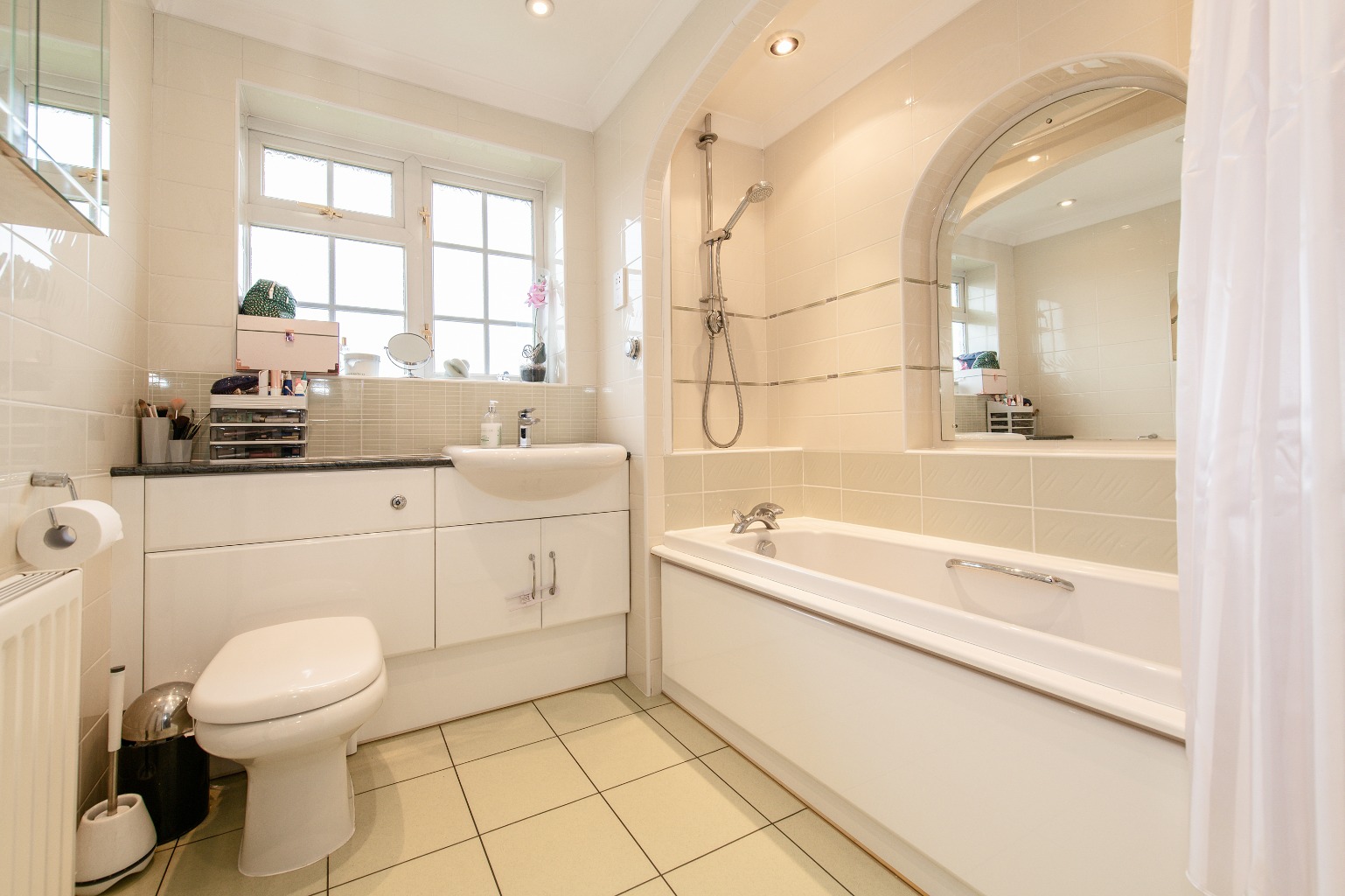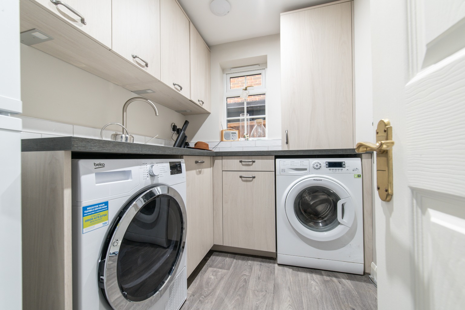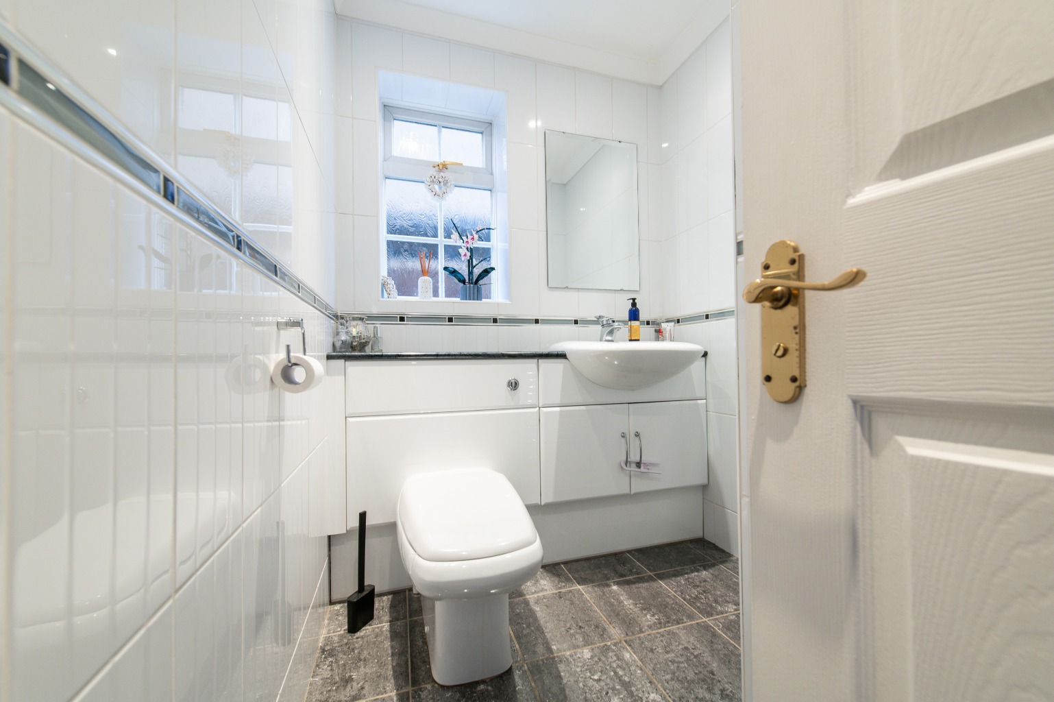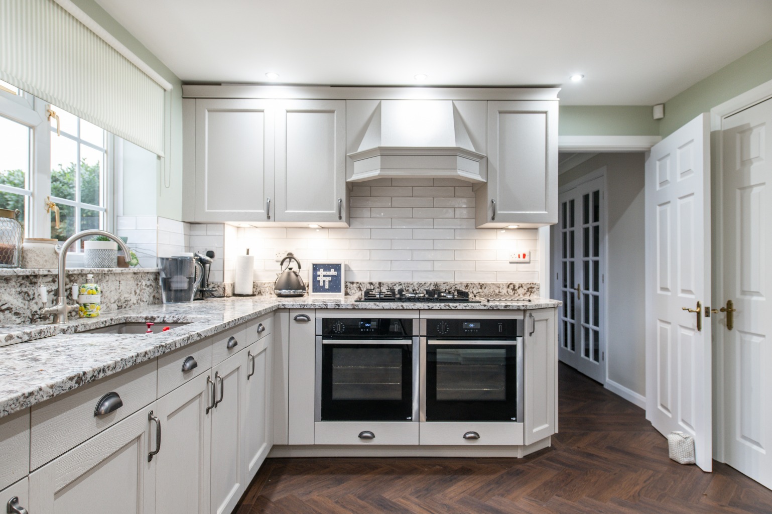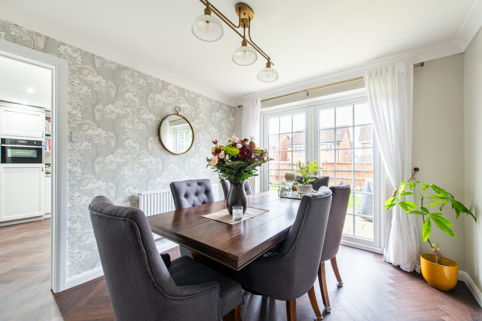 Moving through the home, you’ll find the separate dining room, which is accessed via double doors from the living room. This layout ensures a smooth flow, making it ideal for hosting dinner parties or enjoying meals with loved ones. The dining room connects seamlessly to the kitchen, the true standout feature of the property. With its stunning design and contemporary finishes, the kitchen not only provides a beautiful space to prepare meals but also opens onto the garden through French doors, creating an effortless indoor-outdoor living experience. For added practicality, a utility room helps keep the kitchen tidy and organized, while a downstairs W/C enhances convenience for both family and guests.